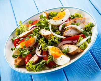 Salade, poulet mariné, tomates, oignons…